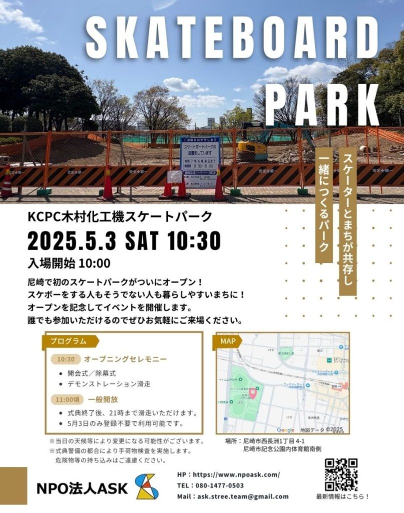 2025年5月3日 / 最終更新日時 : 2025年5月3日 林ひさひろ ブログ スケートパークオープン 7年半前に市議会で提案した『スケートパーク』が、ついに尼崎市に誕生しました。時間はかかりましたが、少しずつ形になり、ようやく実現したことを嬉しく思います。関係者の皆さま、そして声を届けてくださった市民の皆さまに感謝いたします。これからも、若い世代の居場所づくりに取り組んでまいります。ASKの皆さん応援しています‼️ KCPC木村化工機スケートパーク NPO法人ASK 尼崎市 FacebookXBlueskyCopy