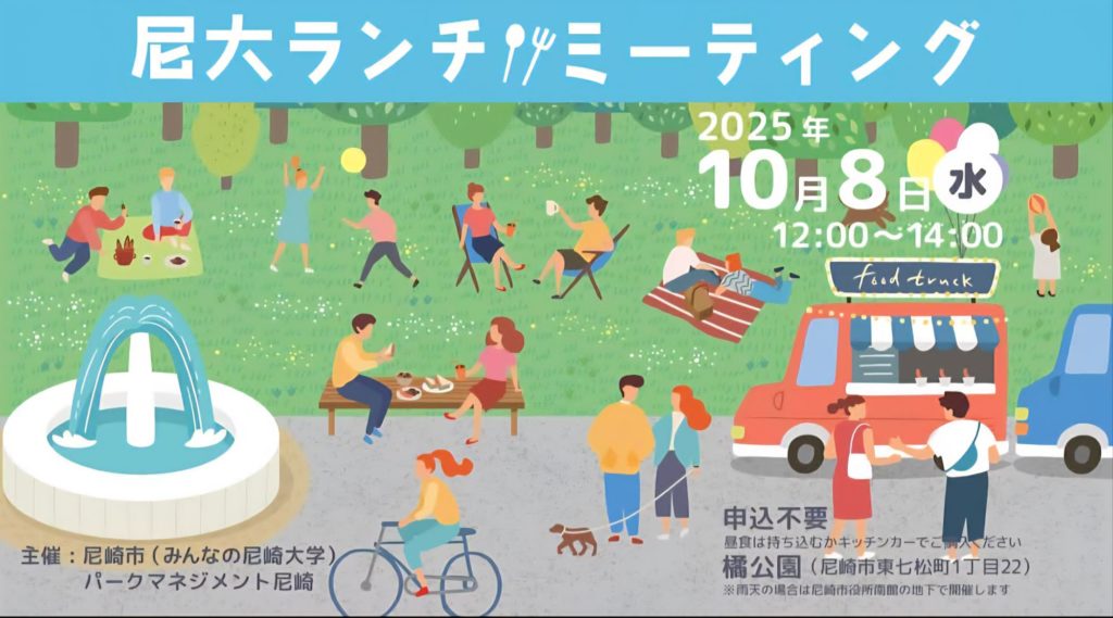 2025年9月23日 / 最終更新日時 : 2025年9月23日 林ひさひろ ブログ 尼大ランチミーティング‼️ 尼崎市役所のおとなりにある橘公園で、ランチミーティングを開きます‼️集まったいろんな人と自己紹介をしたり情報交換・交流したりと、みんなでおしゃべりをする場です。誰でも参加できますので、期間限定で出店しているキッチンカーのご飯や持参したお弁当を食べながら、ゆるやかな時間を過ごしましょう。◯日時2025年10月8日(水)12:00〜14:00◯場所橘公園(尼崎市東七松町1丁目22)※雨天の場合は、尼崎市役所南館の地下で開催します。 FacebookXBlueskyCopy