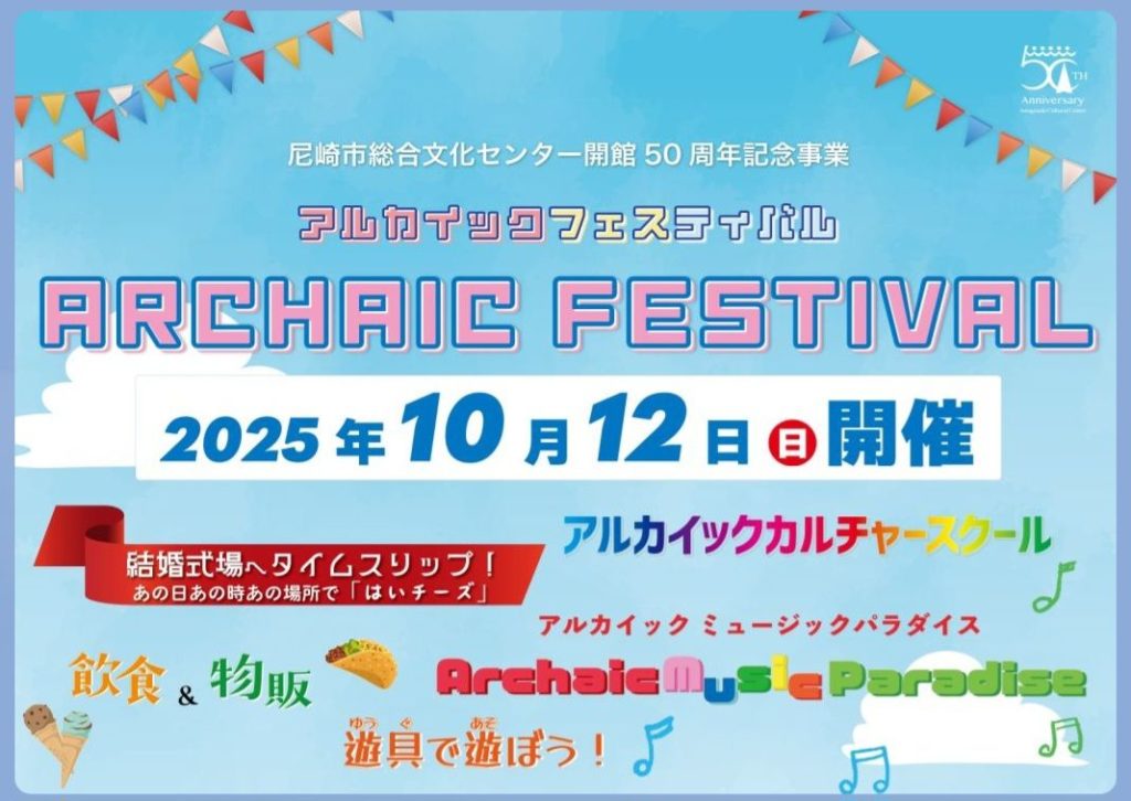 2025年10月10日 / 最終更新日時 : 2025年10月10日 林ひさひろ ブログ アルカイックフェスティバル 【アルカイックフェスティバル開催‼️】10月12日(日) 10:00〜17:00尼崎市総合文化センター開館50周年を記念して、全館を使った『アルカイックフェスティバル』が開催されます‼️屋外ステージでの音楽ライブ、飲食・雑貨ブース、体験イベントなど盛りだくさん✨文化とにぎわいがあふれる1日になりそうです😊 尼崎市 アルカイックフェスティバル FacebookXBlueskyCopy