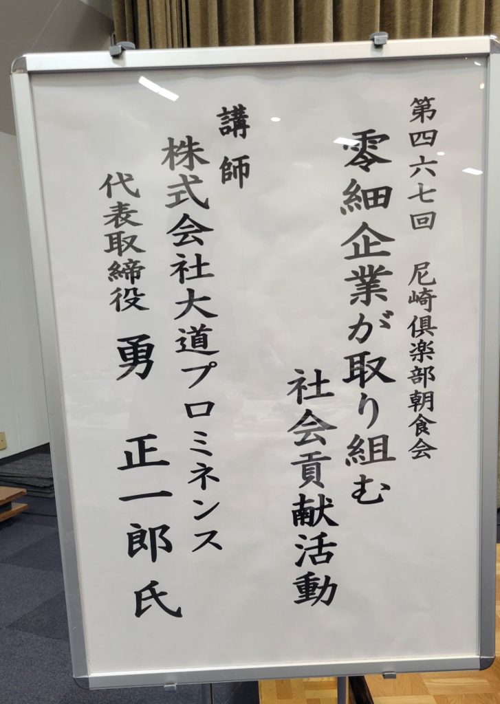本日の朝食会は、株式会社大道プロミネンス・代表取締役 勇 正一郎氏を講師にお迎えし、「小さな会社の小さな社会貢献」をテーマにご講演いただきました。