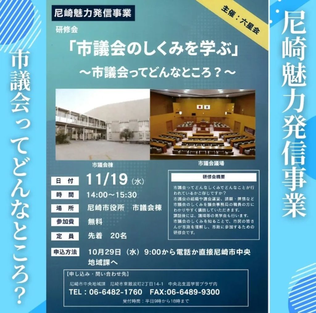 2025年11月19日 / 最終更新日時 : 2025年11月19日 林ひさひろ ブログ 六星会・研修会 尼崎市役所・議会棟で『六星会』の研修会『市議会のしくみを学ぶ 〜市議会ってどんなところ?〜』が開催されました。六星会は、尼崎市にある6つの地区会が連携してつくる市民団体で、地域の声を市政に届ける“市民の代表チーム”として活動しています。今回の研修会では、市議会の役割や議員の仕事について、わかりやすく学んでいただきました。市議会をもっと身近に感じていただく、たいへん有意義な時間となりました。 六星会 尼崎市 林ひさひろ 林久博 尼崎市役所 FacebookXBlueskyCopy