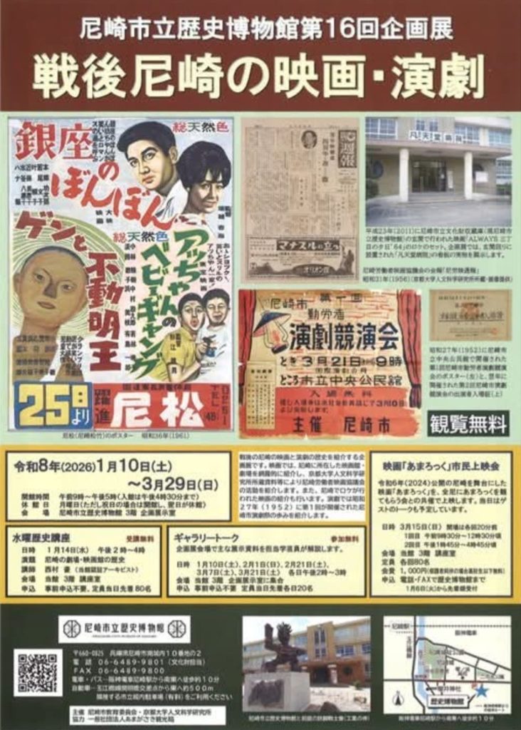 戦後の尼崎の映画と演劇の歴史を紹介する企画展です。映画では、尼崎に所在した映画館・劇場を網羅的に紹介し、京都大学人文科学研究所所蔵資料等により尼崎労働者映画協議会の活動を紹介します。また、尼崎でロケが行われた映画の紹介も行います。演劇では昭和27年(1952)に第1回が開催された尼崎市演劇祭の歩みを紹介します。