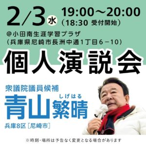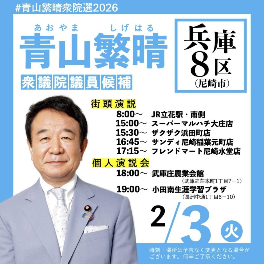 2026年2月3日 / 最終更新日時 : 2026年2月3日 林ひさひろ ブログ 青山繁晴候補2/3(火) 『青山繁晴』本日も市内を駆け巡ります‼️ 青山繁晴 兵庫8区 尼崎市 FacebookXBlueskyCopy