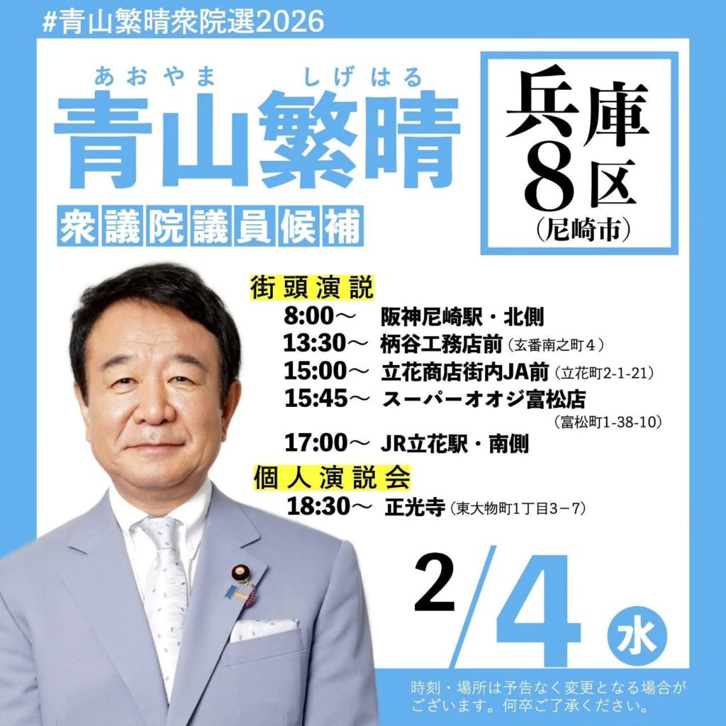 2026年2月4日 / 最終更新日時 : 2026年2月4日 林ひさひろ ブログ 青山繁晴候補ガンバレ‼️ 『青山繁晴』本日も市内を駆け巡ります‼️ 青山繁晴 兵庫8区 尼崎市 FacebookXBlueskyCopy